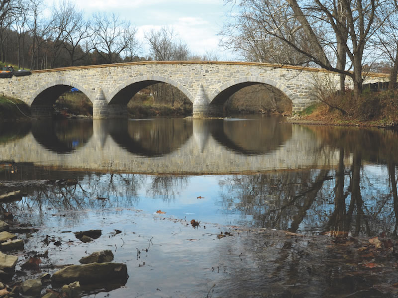 Master builder John Weaver and a handful of farmers built Rohrbach’s Bridge over Antietam Creek in 1836. They built the creamy white stone bridge with three magnificent barrel arches and elegant proportions: 14 ft. 9 in wide and 125 ft. long. They made w