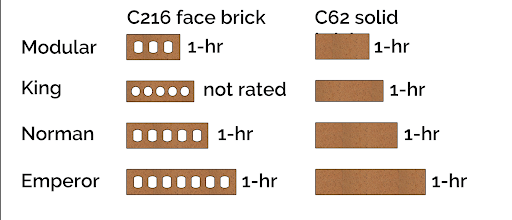 For typical 3-5/8” deep brick facing material that has up to 25% voids in the bedding plane (allowed by ASTM C216) will attain a fire-resistive rating of 1-hour, based on an equivalent solid thickness of 2.71 inches [3.625” x 0.75 solid = 2.71” inches equivalent solid thickness; which is greater than 2.7” as per the table in the 1- hour column for solid brick]. King size brick with 25% void does not meet the minimum equivalent solid thickness due to the 3” bed depth. For King size brick to meet the 1-hour rating, the void percentage would need to be reduced to 10%. [3” x 0.90 = 2.7”].