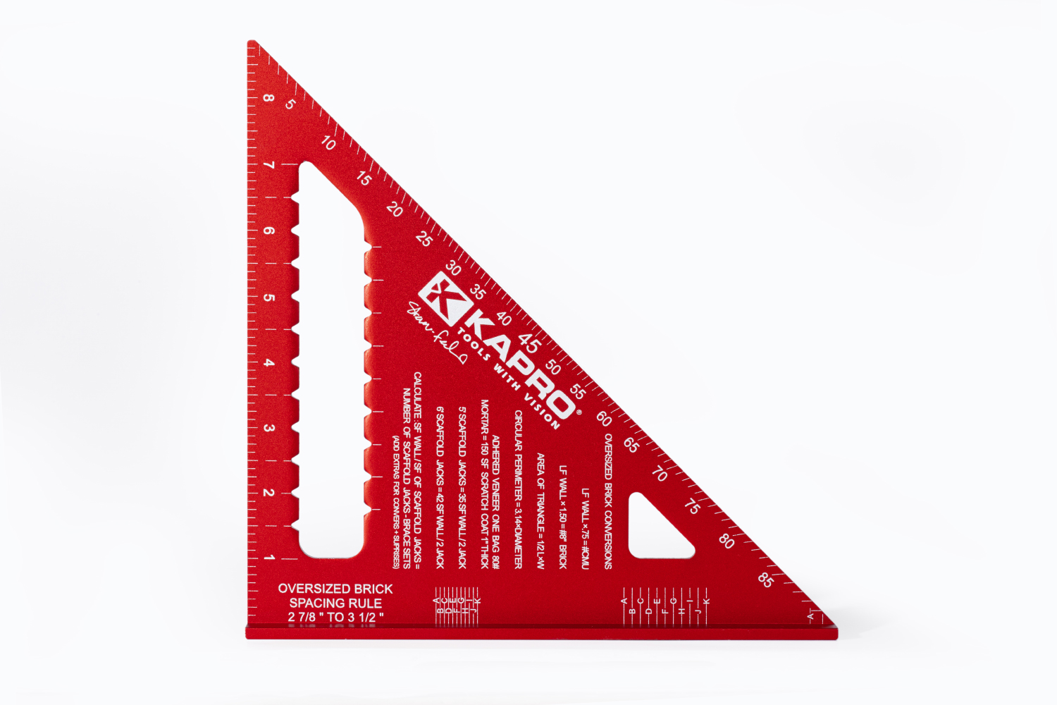 The Mason Square is really handy for an apprentice, a young foreman, or a journeyman as the conversions offer information for figuring scaffolding, layout of corners, mortar and sand amounts, and even wall ties and wall wire. They cover almost everything needed to calculate a small change order or assist with getting enough material to wrap up the week. The tool can be used to calculate cutting rakes, finding plumb, and turning radius for arch templates.
