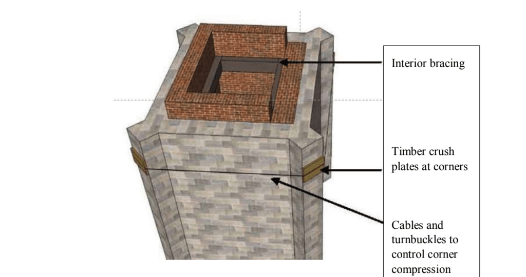 The project team considered conventional stabilization schemes like cabling the upper brickwork and installing retrofit anchors. But, each method had drawbacks. The cabling would be difficult to restrain the entire face of the brickwork; timber bracing would have to supplement the cables. The edge pressure of the cables would be excessive due to the corner damage. Cold-weather installation of adhesive anchors would be a problem. In addition, a large amount of drilling could further destabilize the damaged face brick.